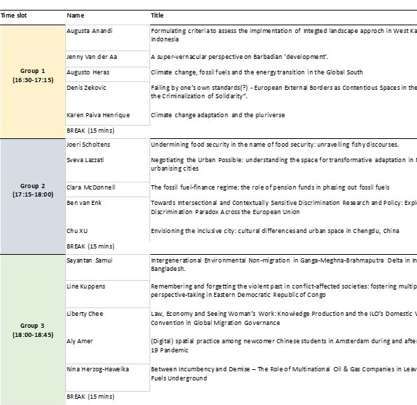 – The justice implications of leaving fossil fuels underground: mapping stakeholders and mobilizing agents of change. Organised by: Frank de Morrée; Nina Herzog-Hawelka; Augusto Heras; Moataz Talaat; Clara McDonnell; Opal Morales Asencio; Crelis Rammelt (GID, UvA).